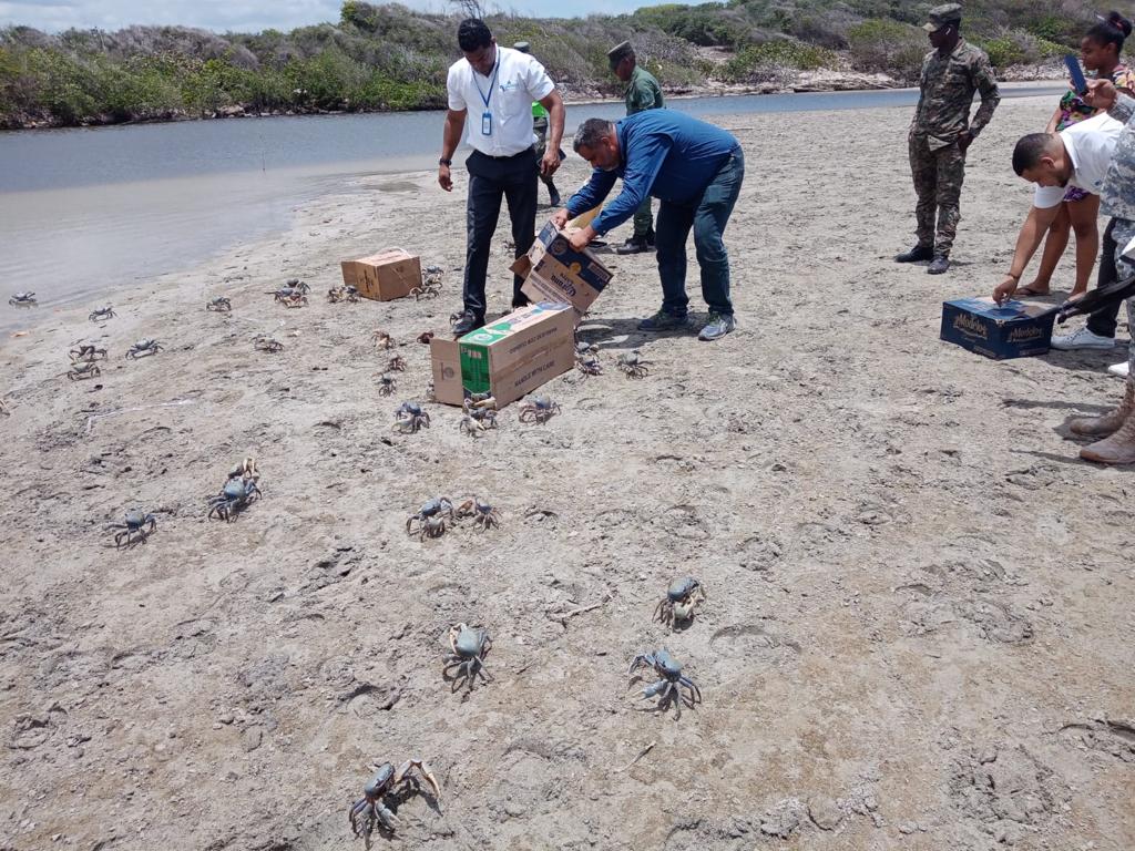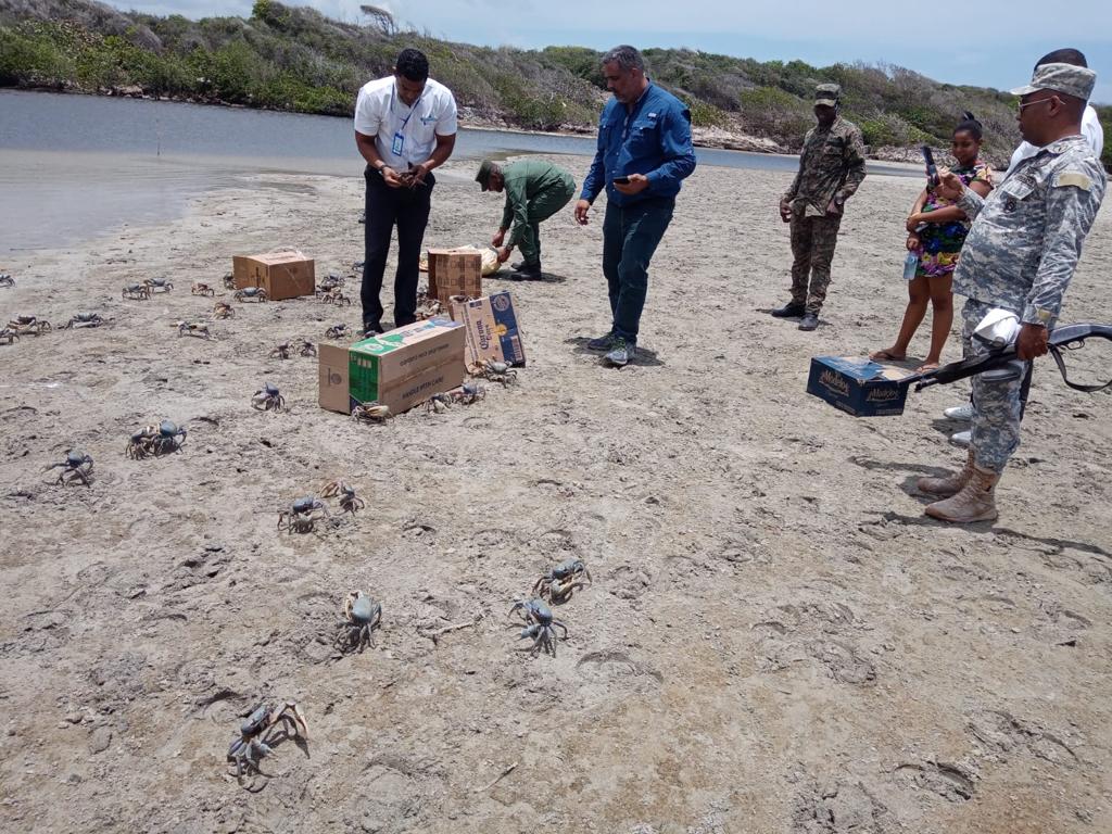 En el día de la fecha 04/5/23 fue realizado un operativo en conjunto con el encargado provincial de coodopesca de la provincia higuey,El señor Juan Luis Martínez y un personal del ministerio de medio ambiente senpa encabezado por el segundo teniente Sabino Gómez encargado provincial de Higuey donde se incautaron un aproximado de mil sienta cincuenta cangrejo a la señora Luz María Solimán portadora de la ced.028.0021755.2 a la cual se le notificó el porque fue la incautación ya que los mismo se encuentra en veda, Después fueron liberados en la boca del Río Anamuya Macao. C/A juan c Peña Ogando ARD.